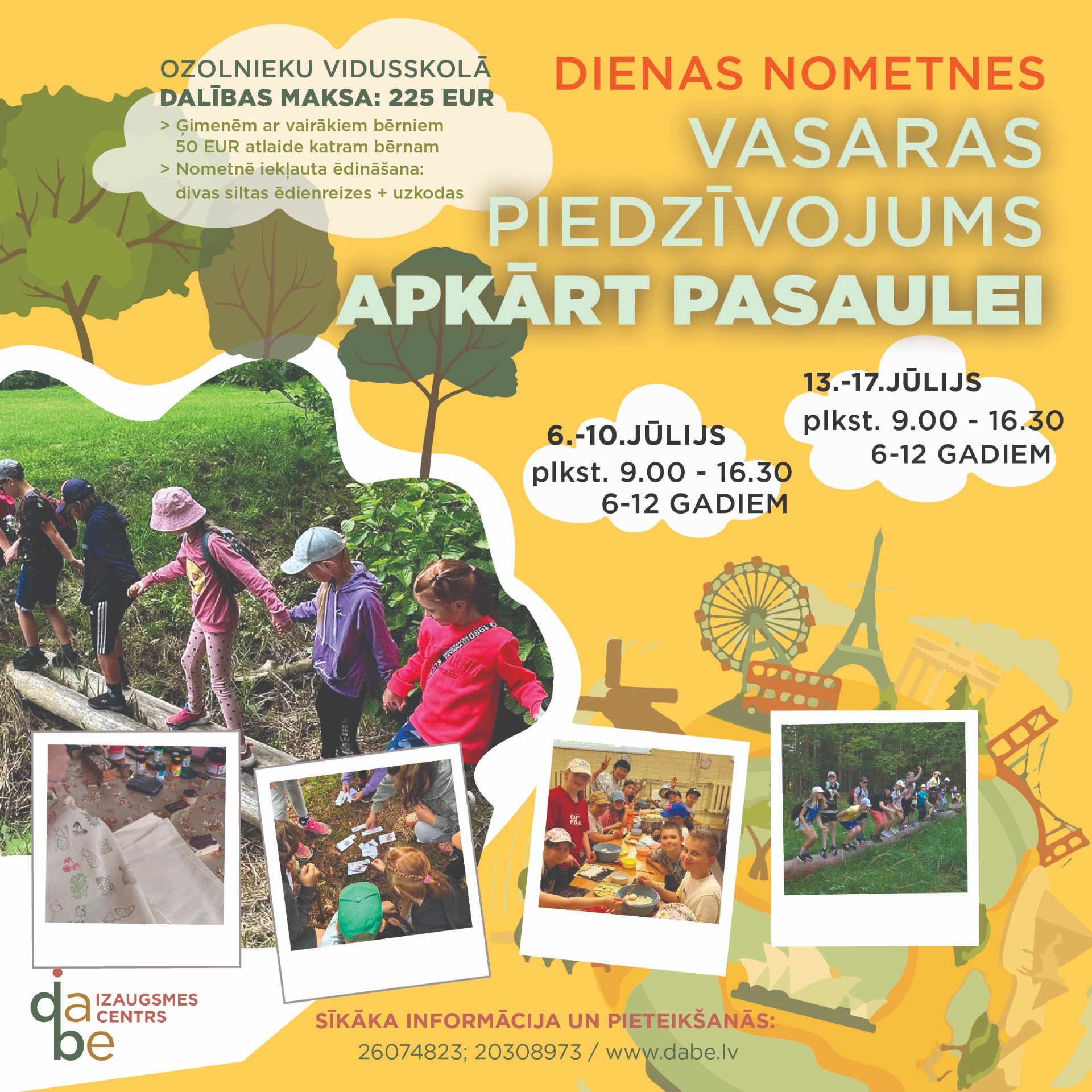 Pilnveido personību nometnē "VASARAS ZAĻAIS PIEDZĪVOJUMS APKĀRT PASAULEI 2023🌍": katru dienu iepazīsti citu valsti, kultūru un tradīcijas, dodies ekspedīcijās dabā🌳, piedalies radošās darbnīcās🎨, asini prātu atjautības uzdevumos💡 un veic zinātniskus eksperimentus🧪!